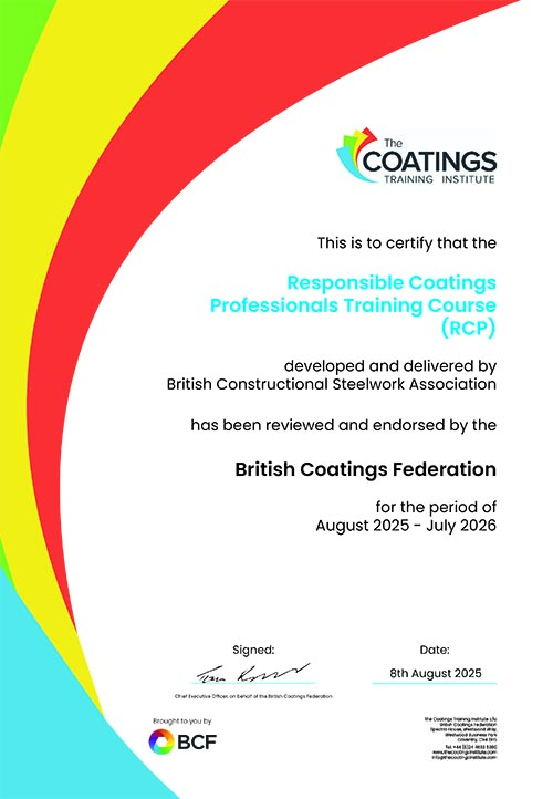 The BCSA’s primary goal is to improve quality and reduce failures, as well as the associated cost of rectifying them, for the good of the industry. So, the RCP course is designed to educate those professionals in the supply chain who have responsibility for protective and intumescent coatings but would like more knowledge to better manage risks. It is therefore suitable for consultant engineers, specifiers, directors, managers and supervisors as well as potential coatings’ inspectors and paint makers. The course adopts key European Standards as used by the industry.